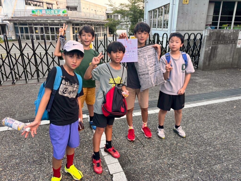 コーチが考えてくれたレクリエーションを楽しんでいる間にバスは小学校へ到着。