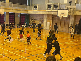 まずは全学年で尻尾取りゲーム。さすが普段バスケをしている子どもたちは機敏に走り回りますが、保護者さんも負けていません!